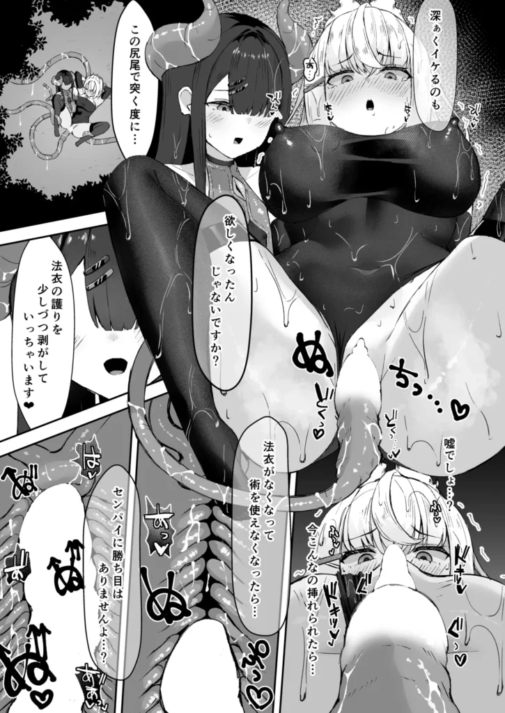 人々に害を成す妖魔を討伐するための組織、妖獣対策局。 そこに所属する上級術師、焔咲 白の物語。 任務に参加した白は、後輩の指月 司を窮地から救い見事妖魔を撃破する。 討伐を果たしたと思われたが、司が逃げ延びた妖魔からの襲撃に遭い、 身体を奪われてしまう… そして白は新たな任務に赴いた先で、妖魔と共に行動する司に遭遇する。 圧倒的な司の力になすすべもなく、身体を弄ばれてしまう白… 更に司によって力を制限され、難なく倒せるはずの 下級妖魔も倒せず、淫猥な触手に絶頂させられてしまう…